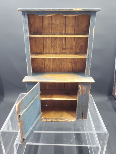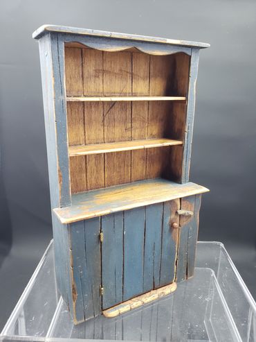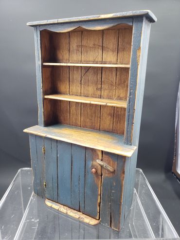 This beautiful 1:12 scale blue painted and aged stepback cupboard was made by IGMA artisan Cindy Malon in 1988. It measures 6" tall by 3 3/4" wide and 1 3/8" deep. It signed and dated by the artist. Door and hinges in good working condition. It looks amazing holding a selection of stoneware pottery (not included.)
